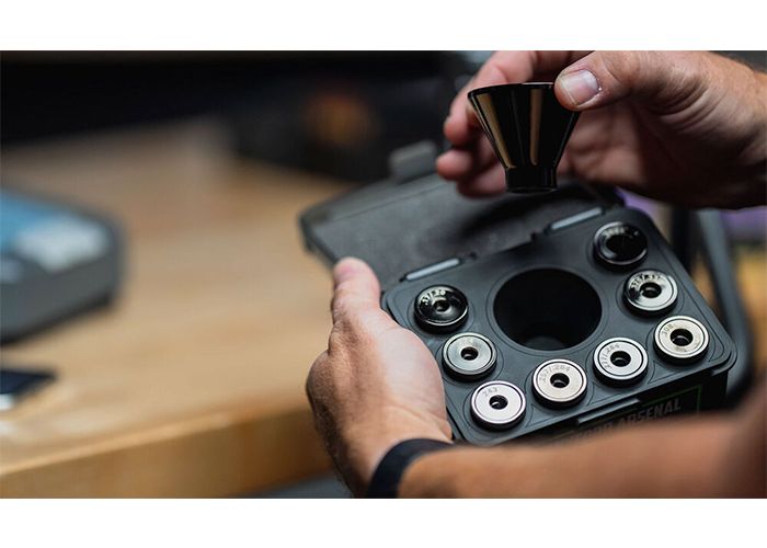 This eight-piece powder funnel set accommodates calibers ranging from .17 through .45. Each funnel is precision-machined for a proper fit and comes neatly organized in a durable storage case, keeping your reloading bench clean and efficient.
